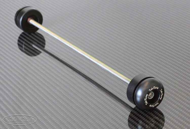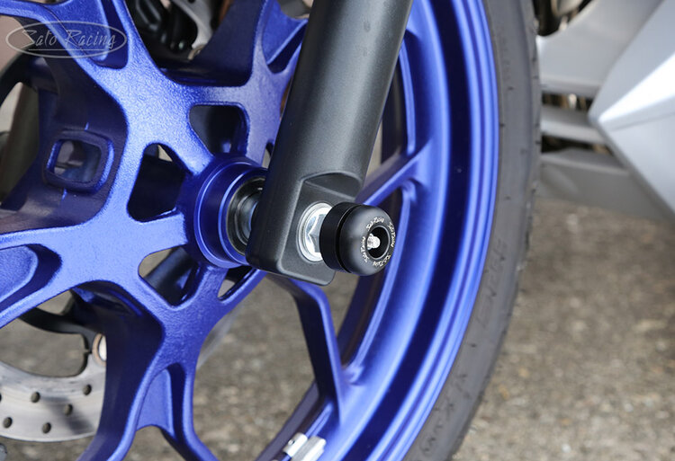 SATO RACING Front Axle Sliders for 2015-18 Yamaha YZF-R3* feature tough slider pucks made out of high density black DELRIN, a low-friction, abrasion-resistant material ideal for protecting the bike from scrapes or more serious damage if you lay it down at speed on the track. The sliders have a standoff sufficient to keep the lower fork, wheel rim and front brake parts from touching the pavement in a crash or fallover, with the slider pucks absorbing and dissipating any potential damage. Axle Sliders are fastened to the front axle hub with a stainless steel through-bolt. Easy install.