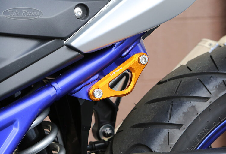 SATO RACING Racing Hook for 2015+ Yamaha YZF-R3 and MT-03 provides a sturdy anchor point in the tail section for attaching a tie-down strap when the L-side passenger peg bracket has been removed. Hook is symmetrical in design, so you could also get a matching R-side hook if you are not using the right side hanger attachment points in the frame, such as if you have an aftermarket shorty-style exhaust. Made of high strength billet aluminum in your choice of Black or Gold anodized finish, with stainless steel bolts.