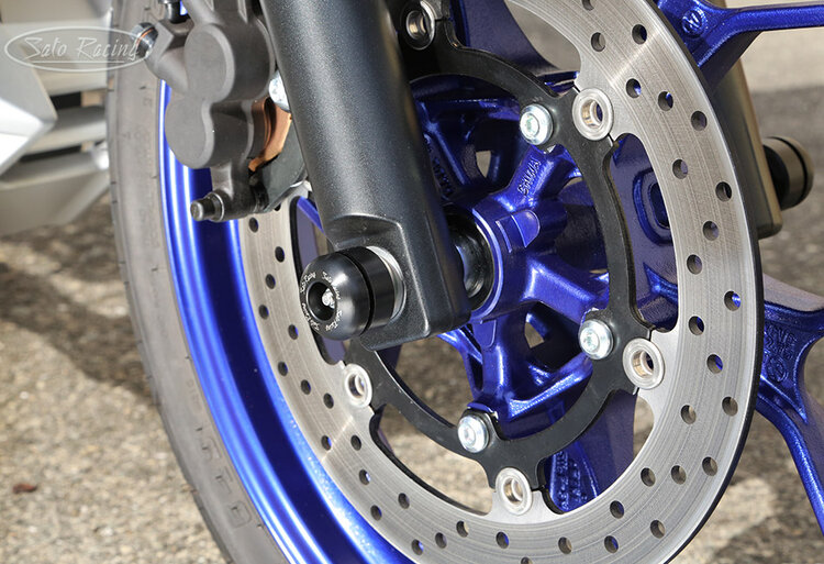 SATO RACING Front Axle Sliders for 2015-18 Yamaha YZF-R3* feature tough slider pucks made out of high density black DELRIN, a low-friction, abrasion-resistant material ideal for protecting the bike from scrapes or more serious damage if you lay it down at speed on the track. The sliders have a standoff sufficient to keep the lower fork, wheel rim and front brake parts from touching the pavement in a crash or fallover, with the slider pucks absorbing and dissipating any potential damage. Axle Sliders are fastened to the front axle hub with a stainless steel through-bolt. Easy install.